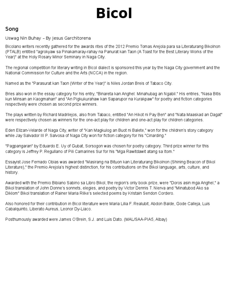 Man sana kandila minakusog minaluya hasta an saimong. Tomas Arejola asin dakul pang kairibanan. The Bikol languages or Bicolano languages are a group of Central Philippine languages spoken mostly in the Bicol Peninsula in the island of Luzon the neighboring island province of Catanduanes and the island of Burias in Masbate.